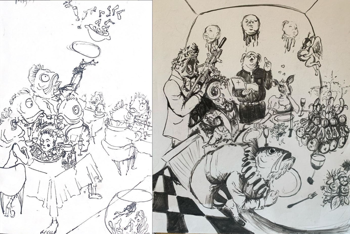 I remember when I was younger; every Sunday, after coming back from church, my dad would stop by the same grocery store each time, and next to it, there was a fish butcher shop. While waiting for my dad to do the groceries, I would stare at the fish outside the shop in the pool and empathize with them. Then, unconsciously, I think these images of killing and cutting stuck in my mind and later were showcased in my art. Later, I actually became vegan for three years for the same reason, but I’m eating fish again now [laughs]. What is interesting for me also with using fish in my art is that they don’t look like they are showing emotions because of their open eyes—their expressions are very subtle. You can achieve the same result by drawing a human without their eyebrows, for example. Sometimes it is not only about it being a subtle feeling; it can be a terrifying gaze or it can express emptiness.